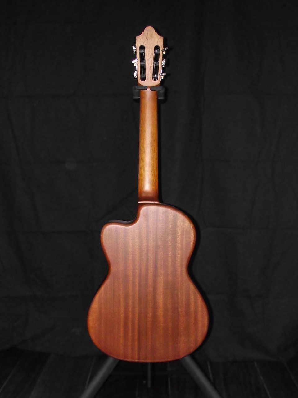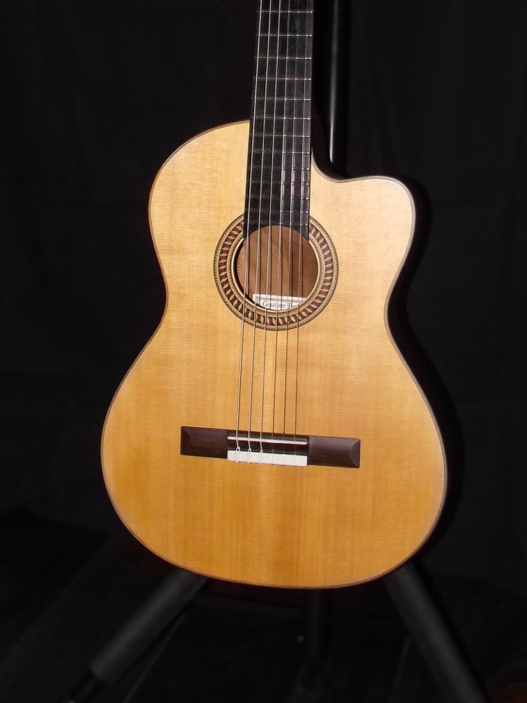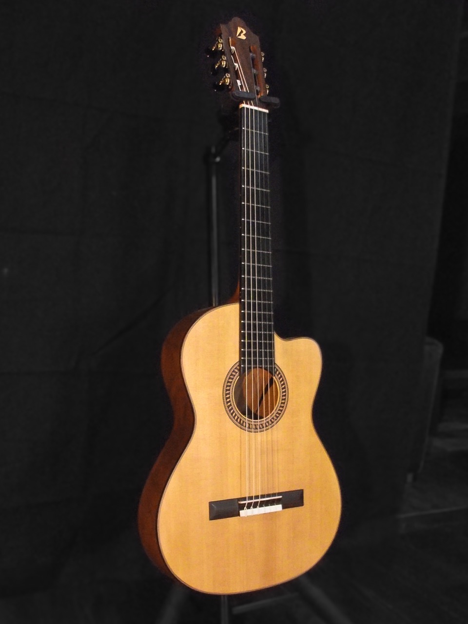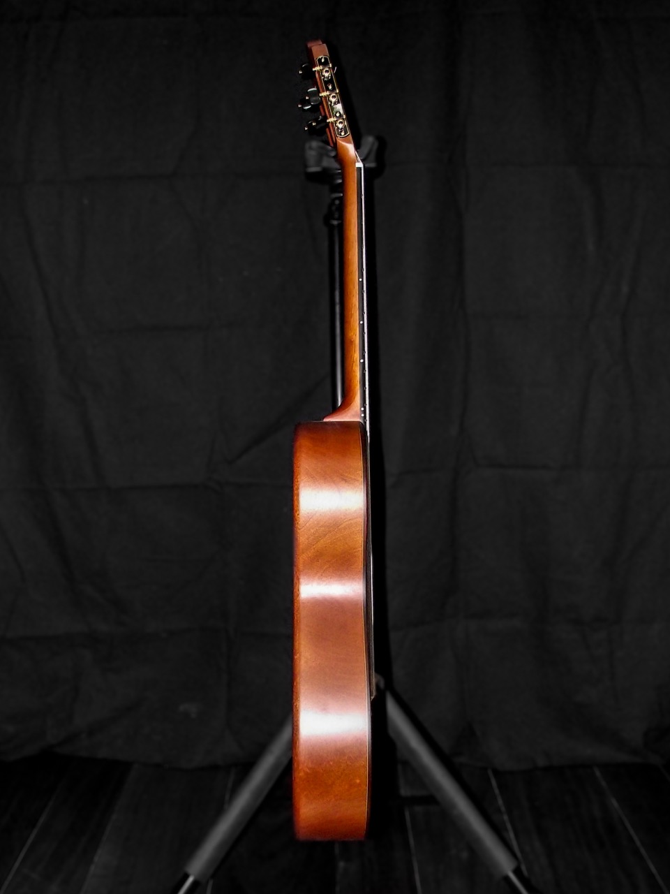 Modèle de guitare classique avec un fond épais et sans barrages et une ceinture d’éclisses taillée dans la masse plutôt que cintrée, dans la continuité de la #62. Cette construction est inspirée de certains modèles de guitares GODIN avec une recherche approfondie sur l’acoustique de l’instrument. Il s’agit bien d’une guitare entièrement acoustique réalisée par Pierre.